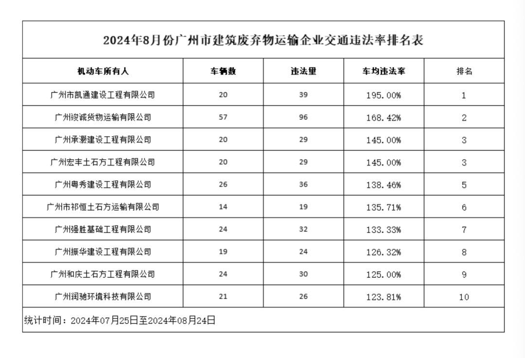 记者8月28日从广州市公安交警部门获悉,为督促相关企业落实交通安全主体责任,预防道路交通事故的发生,广州交警向社会曝光2024年8月份广州市建筑废弃物运输车辆交通违法率排名名单。