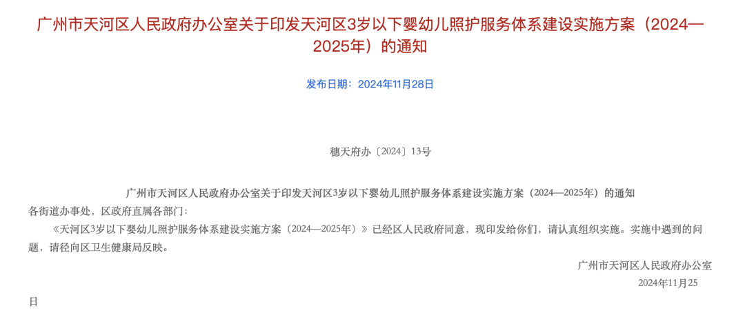 近日,广州市天河区人民政府办公室印发了《天河区3岁以下婴幼儿照护服务体系建设实施方案(2024—2025年)》。《方案》提到,天河将增加托育服务供给,2025年形成“1+21+N”普惠托育综合服务网络。