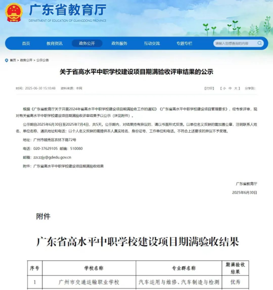 近日,广东省教育厅公示了2021-2024年省高水平中职学校建设项目期满验收评审结果。广州市交通运输职业学校(简称“广州交运”)以总分第一的优异成绩通过终期验收,标志着该校在职业教育领域取得重大突破。