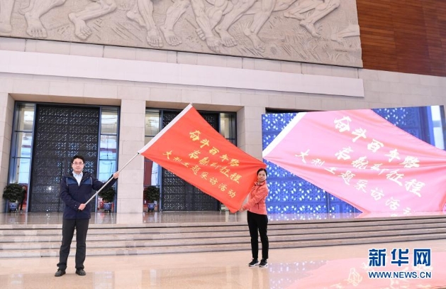1月18日,在北京国家博物馆,记者代表展示“奋斗百年路 启航新征程”大型主题采访活动旗帜。新华社记者申宏摄