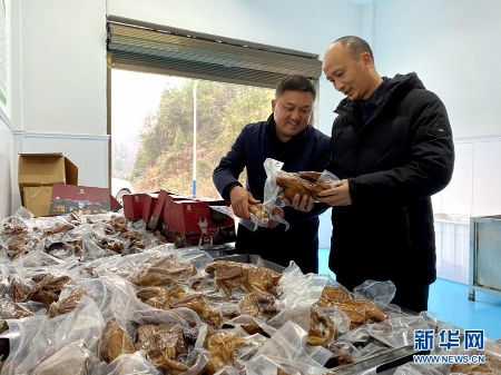 2月3日,在湖南省花垣县民乐镇腊肉加工车间,石峰(左)和车间负责人交流腊鸡肉的销售情况(手机照片)。新华社记者柳王敏摄