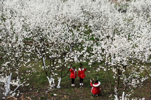 游客在贵州省黔西县新仁苗族乡化屋村的樱桃树下留影(2月19日摄)。新华社记者 杨文斌 摄