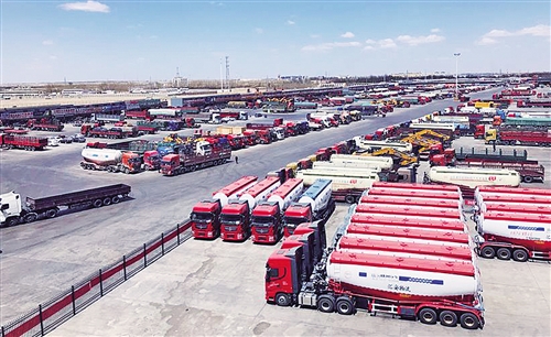 格尔木南昆仑山下的物流园里,一派繁忙景象。本报记者 石晶 摄