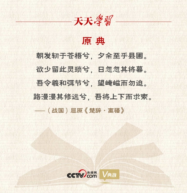 《离骚》为楚辞代表作,全诗共373句,其中以第97句“路漫漫其修远兮,吾将上下而求索”为主线。这句诗的意思是:前方的道路漫长又遥远,我将百折不挠、不遗余力地去探寻。这一传诵千古的名句,激励着一代又一代仁人志士为了真理不懈求索,生死以之。
