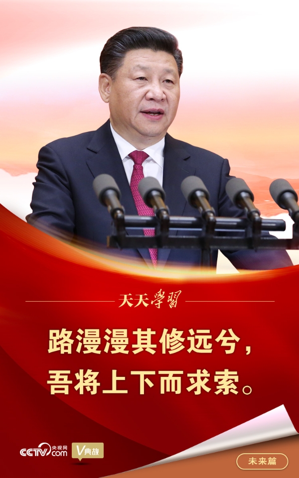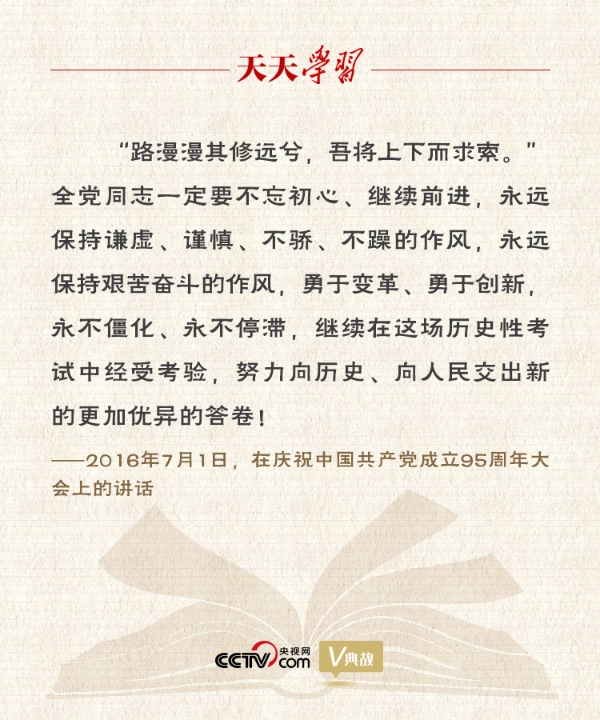 在庆祝中国共产党成立95周年大会上的结束语,习近平总书记在重提“赶考”之后,引用了 “路漫漫其修远兮,吾将上下而求索”,强调这场考试还没有结束,还在继续,今天,我们党团结带领人民所做的一切工作,就是这场考试的继续,激励全党同志一定要不忘初心、继续前进。