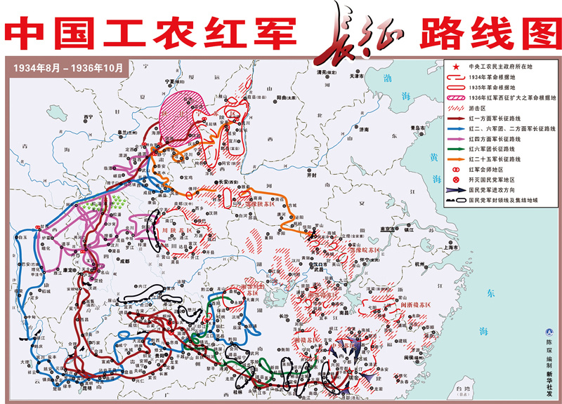 长征这一惊天动地的革命壮举,是中国共产党和红军谱写的壮丽史诗,是中华民族伟大复兴历史进程中的巍峨丰碑。这是中国工农红军长征路线图。新华社发