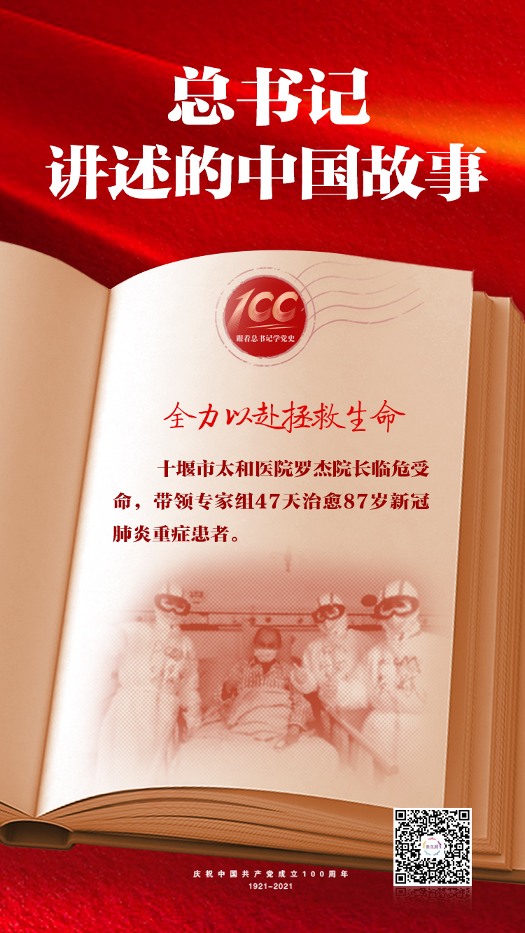 “今天上午,代表通道上一位来自湖北的全国人大代表接受记者采访时说的话,让我印象深刻。”2020年5月22日下午,习近平总书记参加十三届全国人大三次会议内蒙古代表团审议时,提到这样一个细节:“这位代表对记者说,湖北救治的80岁以上的新冠肺炎患者有3000多人,其中一位87岁的老人,身边10来个医护人员精心呵护几十天,终于挽救了老人的生命。什么叫人民至上?这么多人围着一个病人转,这真正体现了不惜一切代价。”总书记所说的这位人大代表,正是湖北十堰市太和医院党委书记罗杰。