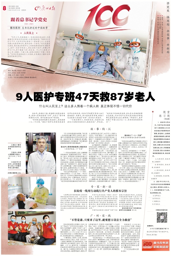 十堰市太和医院9名医护“专班”不分昼夜47天救治87岁老人,正是在抗击新冠疫情中坚持“人民至上”的一个生动示例,医护人员不惜一切代价抢救人民的生命、维护人民的生命健康,在抗疫一线用行动践行共产党人的根本宗旨,书写了对党和人民的忠诚与热爱。