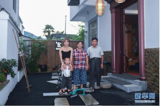 2017年8月9日,在浙江省淳安县枫树岭镇下姜村,村民姜丽娟(左一)与父亲姜北方(右一)、母亲王洋球(中)及儿子安安在自家开办的“栖舍”民宿院内合影。新华社记者黄宗治摄