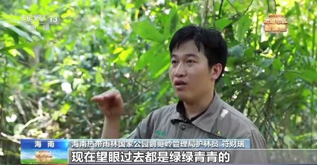 海南热带雨林国家公园鹦哥岭管理局护林员 符财瑞:植被慢慢就恢复起来了,比如以前满山都是光秃秃的,现在望眼过去都是绿绿青青的,就像习总书记说过,绿水青山就是金山银山,现在我们看到这片林子生机盎然,给我们一种很自豪的感觉。