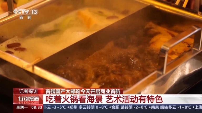 总台央视记者 吴天白:船上工作人员告诉我说,一般的邮轮是不配备火锅餐厅的,因为船在海上航行时会产生晃动,火锅汤汁很容易溅潵出来。而我们国产邮轮不仅重心重量设计控制得好,船两侧还有一对减摇鳍,可以减少88%左右的横摇,让游客们可以放心地围炉畅谈、大快朵颐,而这样的小细节背后也体现着我国船舶建造技术的硬核实力!
