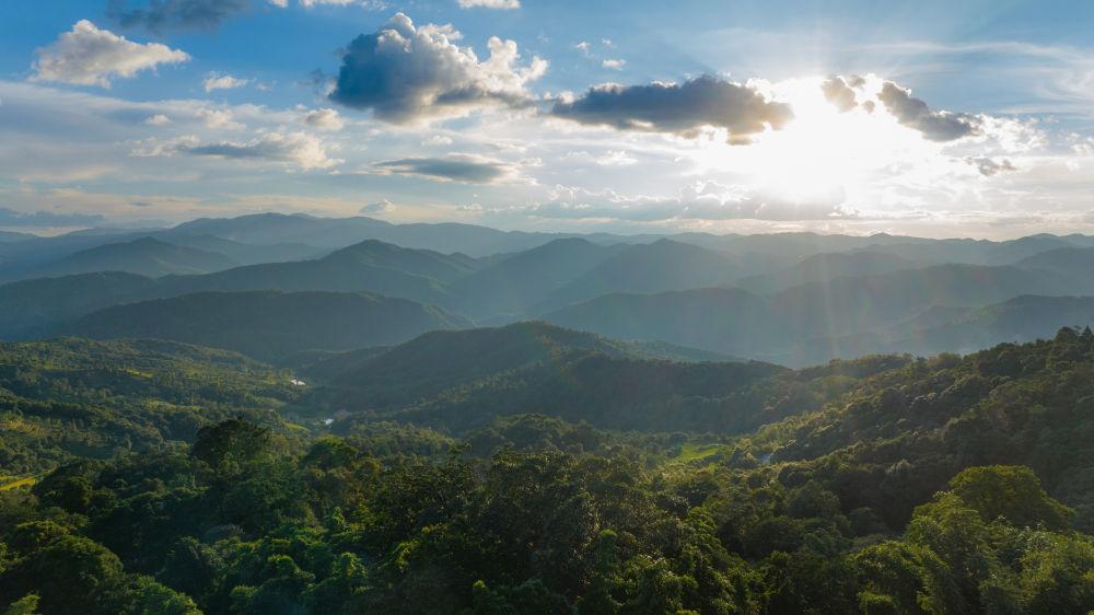 这是2023年9月16日拍摄的日落时分的云南普洱景迈山风光(无人机照片)。新华社记者 胡超 摄