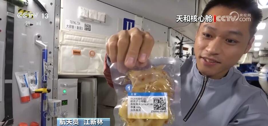 航天员 江新林:我是今天的太空美食家,让我带领大家一起来探索发现今天的太空美食。我们先看一下主食,热乎乎的,看看里面都有什么吧,有01最爱吃的白米饭,小心烫哦,02爱吃的面条,我的炒饭。好了,把它粘在餐桌上。然后再让我们看看我为他们准备的惊喜。看看这是什么?这是我们冬至特意结余的饺子,还有蔬菜副食。地面上的工作人员考虑得特别周到,按照个人的口味为我们准备了美味的食品,而且将它们塑封包装,给我们节余时间的时候又保证它的口味。这是网红太空香粽,大家印象比较深刻吧,还有这个年糕也是特别好吃、特别美味,还有红烩猪排,保证有足够的蛋白质摄入量。很丰盛。请看这里,我们特意留了一些新鲜的水果,看看都有什么吧,有美味的苹果,还有葡萄,大家这个都特别爱吃,我们三个在一起分享一下。