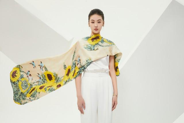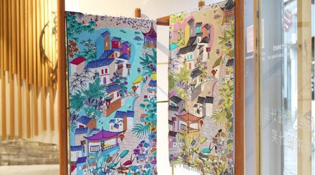 她集中绫、罗、绸、缎四种丝绸工艺于一体,并用刺绣增光添彩,创新设计出融合产品,展示苏工之巧,创新之美。