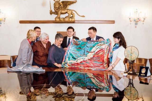 她把意大利威尼斯的贡多拉船和苏州摇橹小船和谐融入一图。用中国红与海洋蓝撞色,亮丽明艳,受到威尼斯市长的惊喜赞叹。