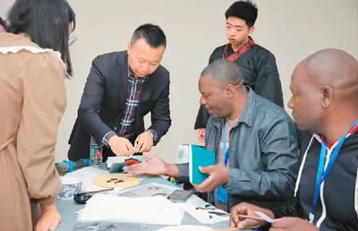 图为学员们在做团扇、写毛笔字,体验中国文化。(图由北京工业职业技术学院提供)