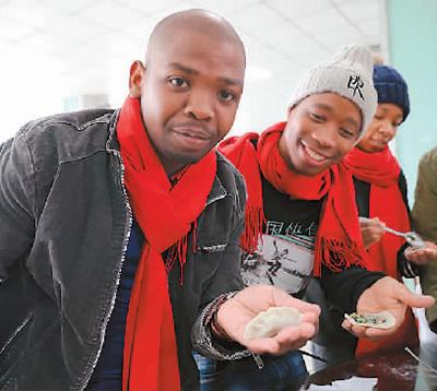 参加杭州职业技术学院开展的“中文+电梯工程技术”研修项目的南非留学生体验包饺子。杭州职业技术学院供图