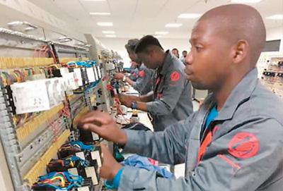 参加杭州职业技术学院开展的“中文+电梯工程技术”研修项目的南非留学生在进行职业技能实际操作。杭州职业技术学院供图