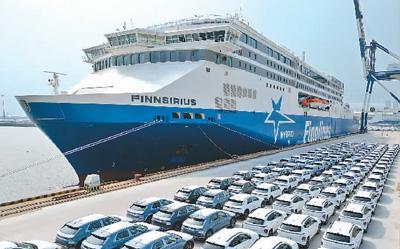 2023年7月25日,油电混合动力高端客滚船“Finnsirius”号在山东港口烟台港装载商品车。唐克 摄(人民视觉)