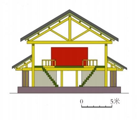 在青关山一号大型建筑基址中,考古工作者还发现穿堂通道、东西大门、单间、木构平台等遗迹。学者推测,这可能是国内迄今发现的年代最早、规模最大的干栏式楼阁建筑,其研究性复原仍须进一步检验和论证。