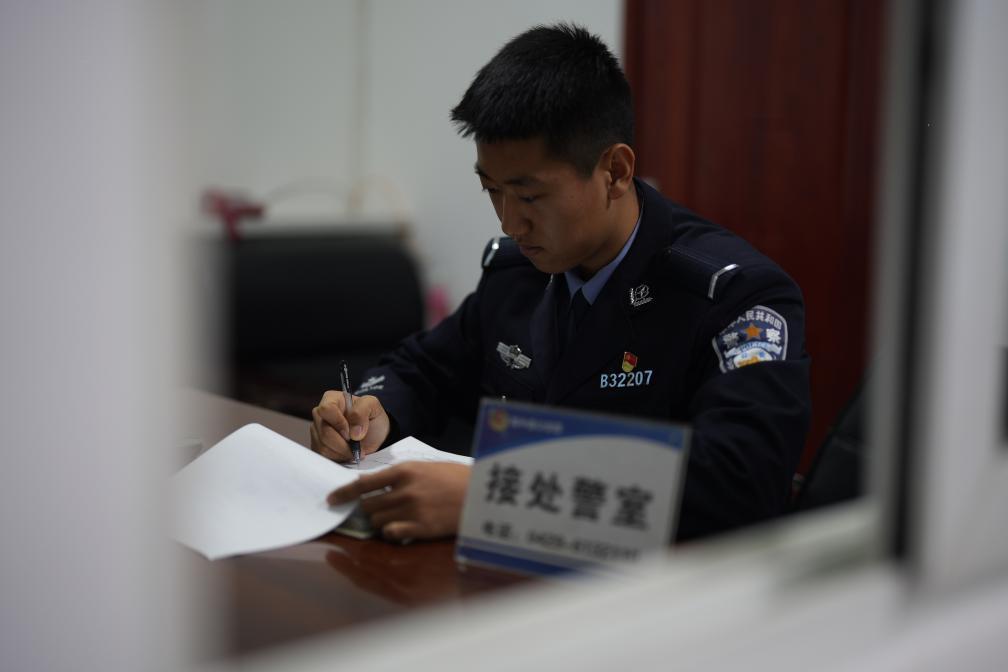 葫芦岛市绥中县公安局机场派出所民警郭佳棋在接处警室工作。新华社记者 李昂 摄