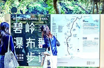 碧岭瀑布群步道前,游客正在观看路线导引。方向生态供图