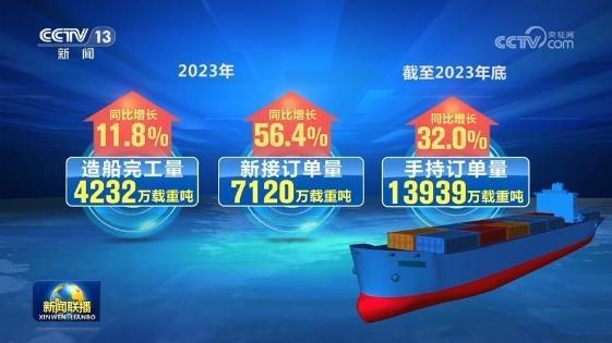 最新数据显示,2023年我国造船完工量4232万载重吨,同比增长11.8%;新承接订单量7120万载重吨,同比增长56.4%;截至2023年底,手持订单量13939万载重吨,同比增长32.0%,所有指标第一次实现2位数增长。