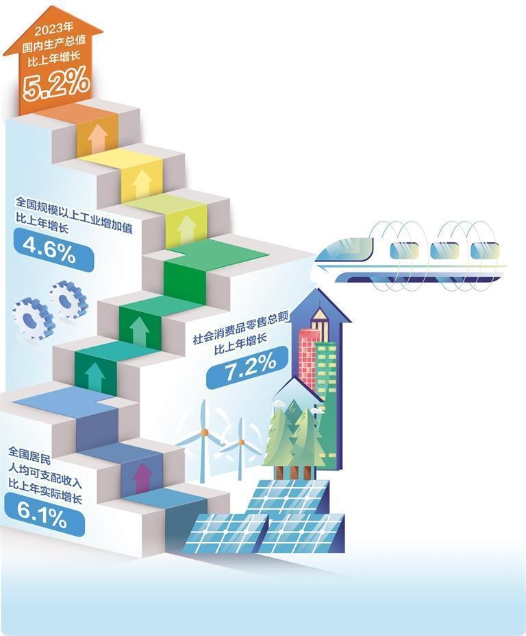 从经济增长看,2023年我国GDP超过126万亿元,增速比2022年加快2.2个百分点。分季度看,呈现前低、中高、后稳的态势,向好趋势进一步巩固。按可比价计算,2023年经济增量超过6万亿元,相当于一个中等国家一年的经济总量。人均国内生产总值稳步提高,2023年达到89358元,比上年增长5.4%。
