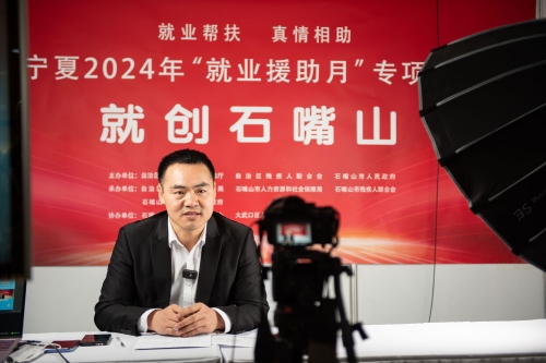 2024年1月5日,宁夏回族自治区就业援助月专项服务活动启动仪式在宁夏石嘴山市万达广场举行,工作人员在活动现场直播带岗。新华社记者 李旭伦 摄