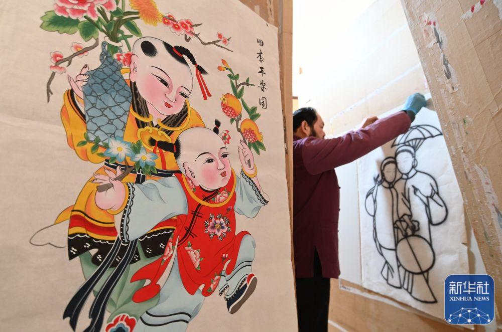 1月21日,在山东潍坊高密市姜庄镇的一家年画作坊,民间艺人在创作扑灰年画。新华社发(李志军 摄)