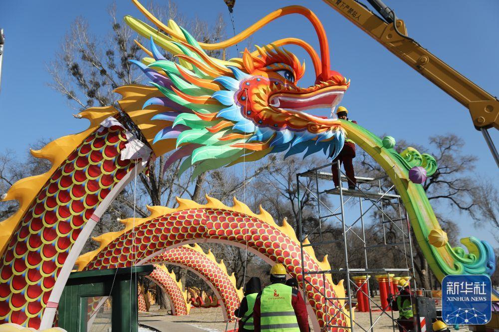 1月21日,在河北承德避暑山庄万树园景区,工人在组装龙型花灯。新华社发(刘环宇摄)