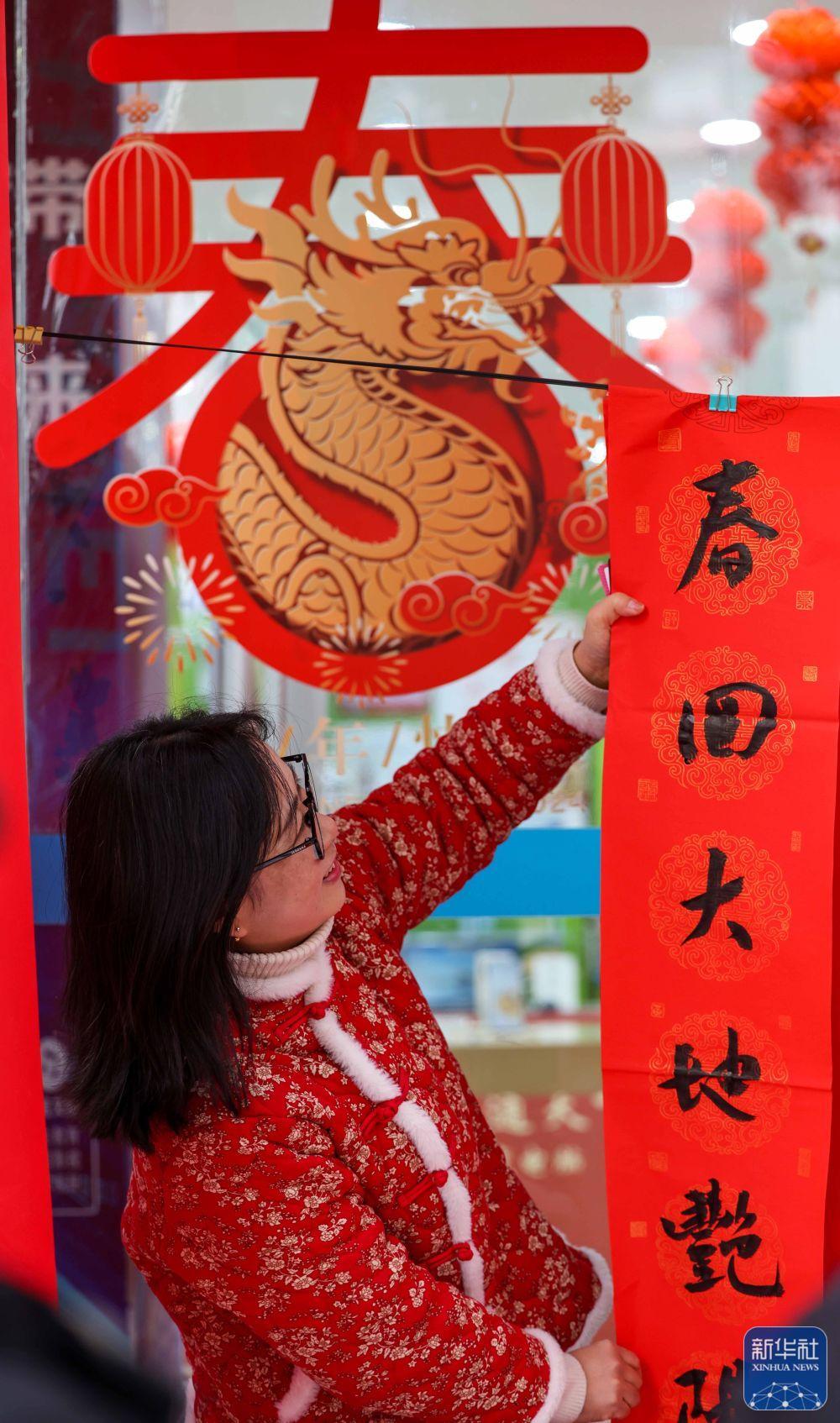 1月21日,在贵州省铜仁市玉屏侗族自治县皂角坪街道紫气山社区,居民在挑选书法志愿者写的春联。新华社发(胡攀学摄)