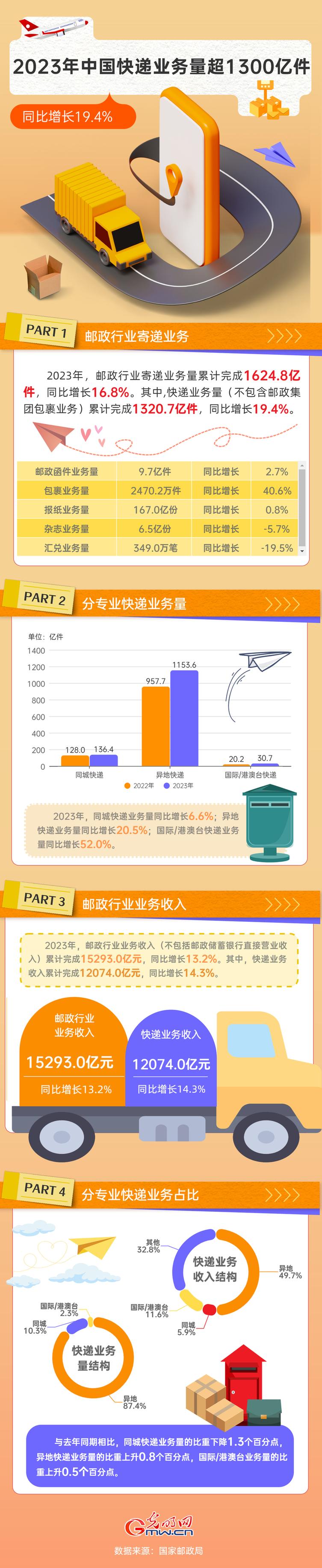 光明网讯 据国家邮政局发布数据显示,2023年,我国邮政行业寄递业务量累计完成1624.8亿件,同比增长16.8%。其中,快递业务量(不包含邮政集团包裹业务)累计完成1320.7亿件,同比增长19.4%。