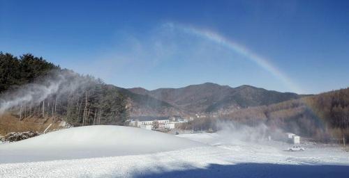 图为内蒙古赤峰市喀喇沁旗美林谷滑雪场在进行人工造雪。新华社发(袁园 摄)