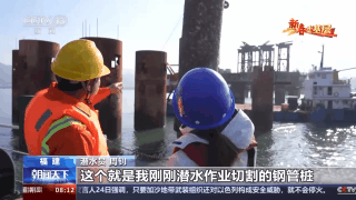 潜水员 周钊:这个就是刚刚我潜水作业切割的钢管桩,在水面上只有那么一点点头冒出来,感觉没啥,吊起来慢慢出水,越来越长,越来越高,51米水深相当于20层楼高,还是觉得自己很了不起。