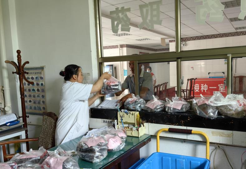 2023年6月20日,山东省聊城市东阿县刘集中心卫生院工作人员在分发中药汤包。新华社记者 张力元 摄
