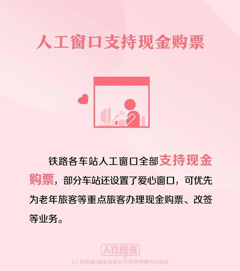 铁路各车站人工窗口全部支持现金购票,部分车站还设置了爱心窗口,可优先为老年旅客等重点旅客办理现金购票、改签等业务。