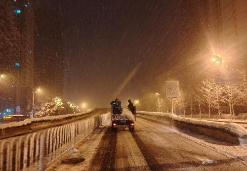 1月22日凌晨,湖南省长沙市天心区城管局、区环卫中心工作人员上路抛洒融雪剂。(天心区环卫中心供图)