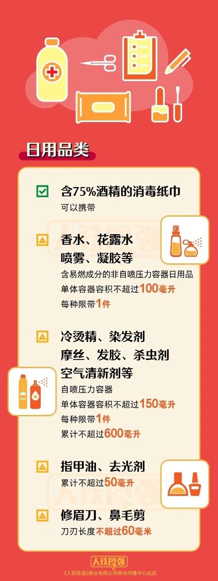 携带香水、花露水、喷雾、消毒凝胶等含易燃成分的非自喷压力容器日用品的,单体容器容积不得超过100毫升,每种限带1件。