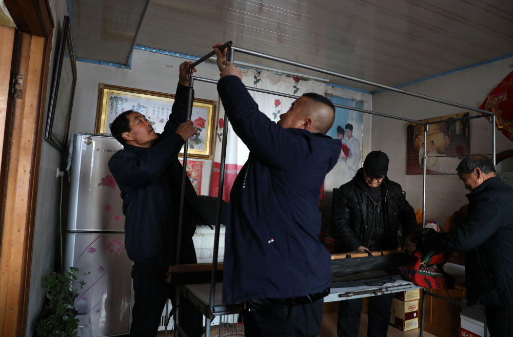 ↑1月25日,吕正业(左一)和他的戏班成员在乡亲家中搭建皮影戏台。