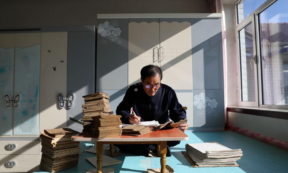 ↑1月24日,吕正业在自己家中为今年将要出版的皮影研究书籍整理收藏多年的戏本,有些戏本已经有百余年历史。