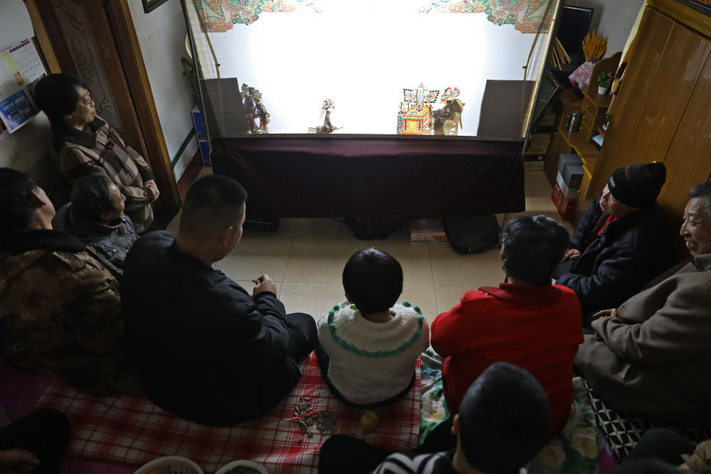 ↑1月25日,街坊邻居在鞍山市黄花甸镇黄花甸村一户农家里观看吕正业和他戏班成员表演的皮影戏。