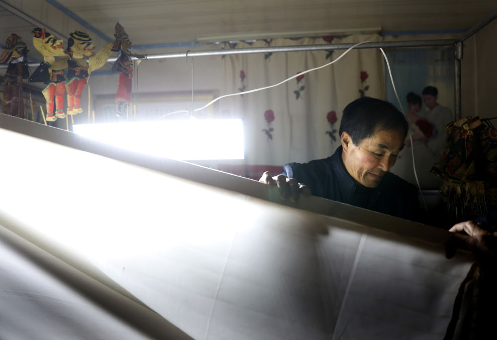 ↑1月24日,吕正业在自己家的工作室里检查表演所要用的皮影。