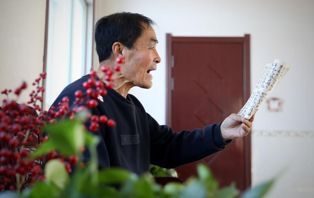 ↑1月24日,吕正业在自己家中对照戏本练习唱词。