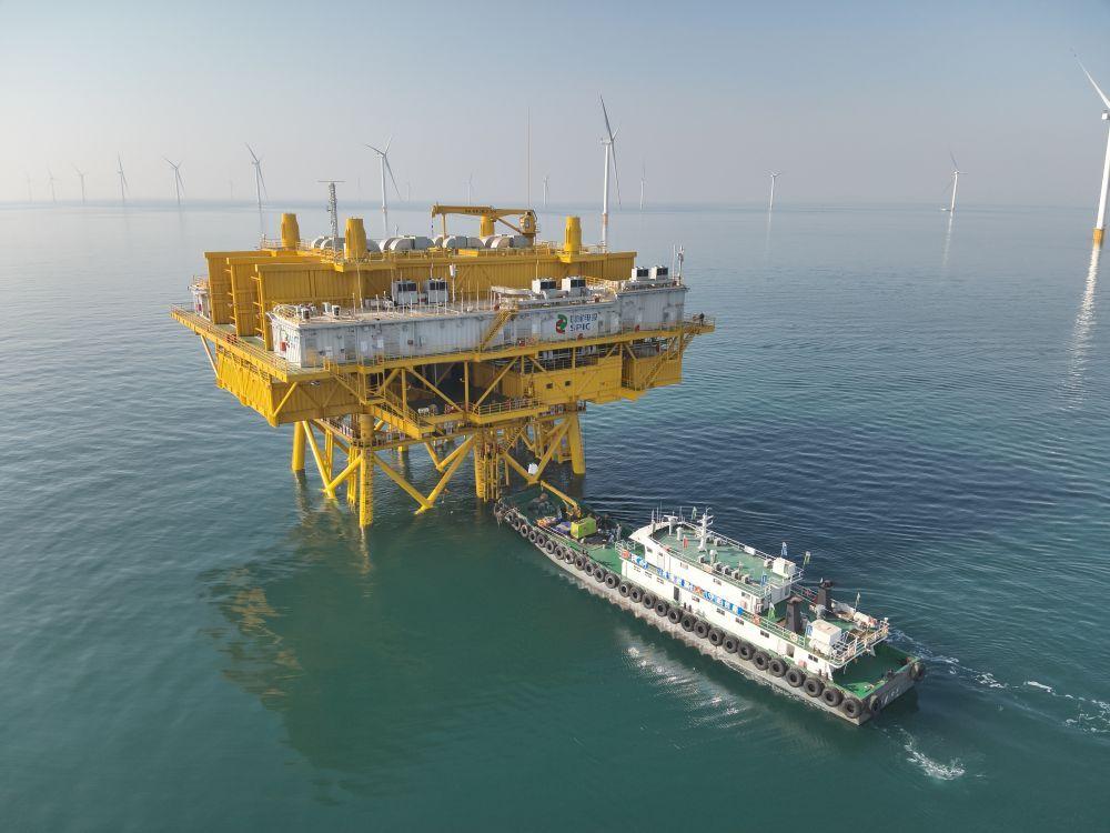 从场站所处的山东省乳山市出发,乘船两个多小时,进入离岸20余公里的山东半岛南U1场址海上风电项目。迎着落日,船停靠在项目的“心脏”——海上升压站。这是一座稳立海上的钢铁建筑,项目一期53台风机发出的电能全部在此汇集、升压,再通过地下电缆送入陆上的千家万户。