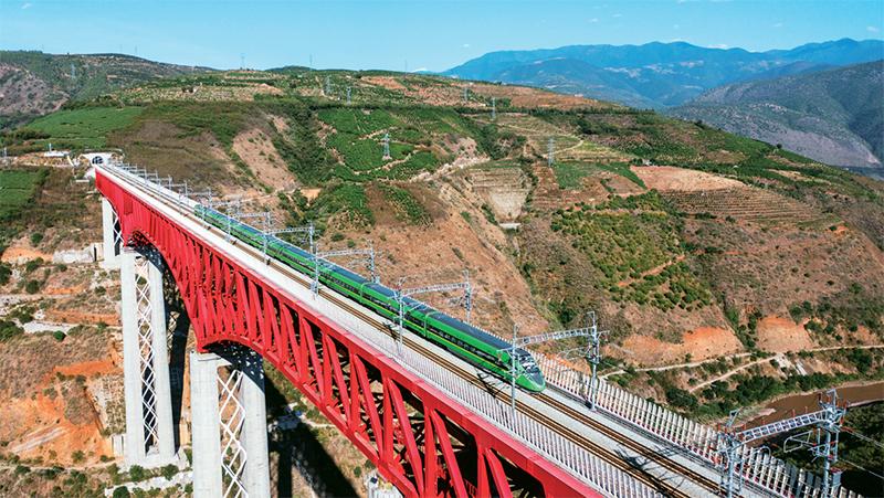 中交集团参建的中老铁路是“一带一路”建设重点项目,于2021年12月3日建成通车。中老铁路是首个以中方为主投资建设运营,全线采用中国技术标准、使用中国设备、与中国铁路网直接连通的国际铁路项目。图为“复兴号”列车通过中老铁路元江特大桥。 新华社记者 胡超/摄