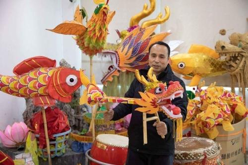 1月30日,南昌市青云谱区城南龙灯工厂,城南龙灯传承人史克滨展示为儿童设计生产的小板凳龙。新华社发(孙睿泽 摄)