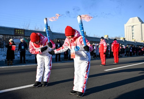 2月3日,在内蒙古呼伦贝尔市满洲里国门景区,火炬手包玲玲(右)和钱卓在火炬传递活动中。新华社记者 连振 摄