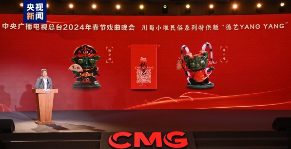 由 “总台文创” 与三星堆博物馆共同推出的新春联名产品——中央广播电视总台2024年春节戏曲晚会川蜀小堆民俗系列特供版“德艺YANG YANG”也在发布会上正式亮相。产品以三星堆博物馆馆藏青铜纵目面具与兽面具为原型,搭配傩戏、变脸等传统戏剧文化元素,创意打造桌面摆件,依托时尚载体让戏曲艺术以全新的方式呈现在大众面前。