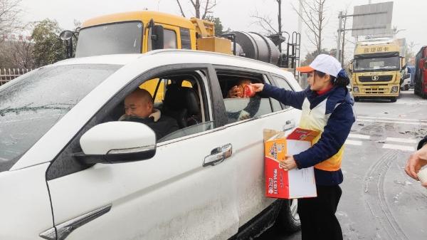 2月3日,在G56杭瑞高速常德段,湖南高速集团常德分公司桃源中心站志愿者,为滞留司乘人员免费发放面包、方便面、姜茶、热水等食品。新华社发(汪思伽 摄)